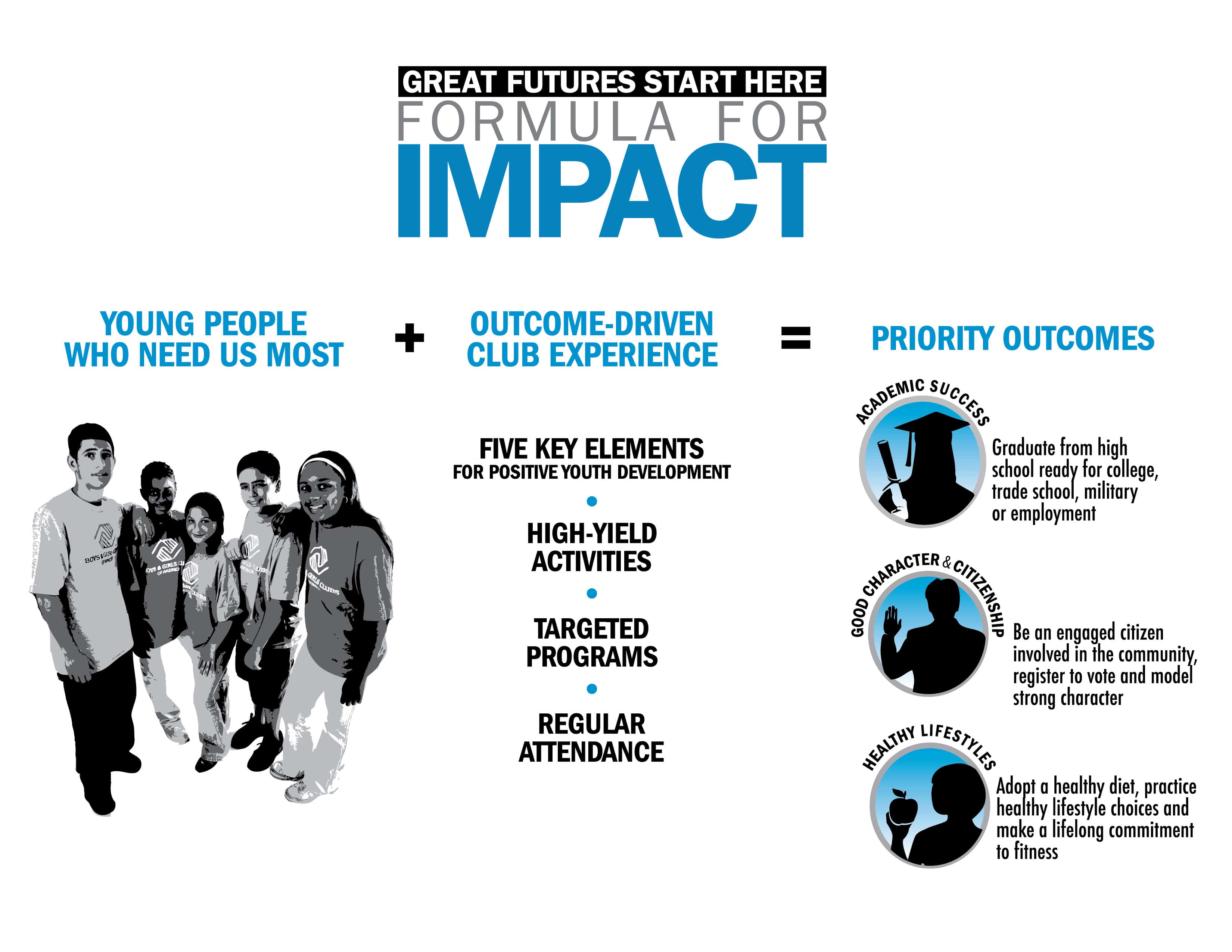The true work of the Boys & Girls Clubs of Bartlesville – the heart of what we do – lies fittingly at the center of our Formula for Impact. To create the optimal Outcome-Driven Club Experience, we provide high-yield activities and targeted programs, actively encourage young people to attend more frequently, and employ Five Key Elements for Positive Youth Development: